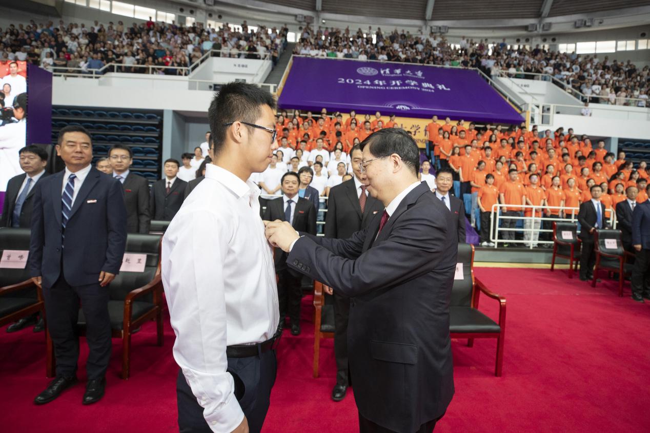 At the opening ceremony, a special segment featured the presentation of Tsinghua University badges to new students. Qiu Yong pinned a Tsinghua badge for an undergraduate student representative.