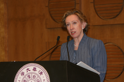 Mrs. Beckett, Minister for the Department of the Environment, Food and Rural Affairs in UK, visited Tsinghua University and made a speech titled “Sustainable Development: The Challenge for the UK and China” in the reception Hall of the Main Building on June 16. Tsinghua Vice President He Jiankun delivered the welcoming speech.