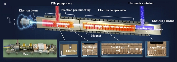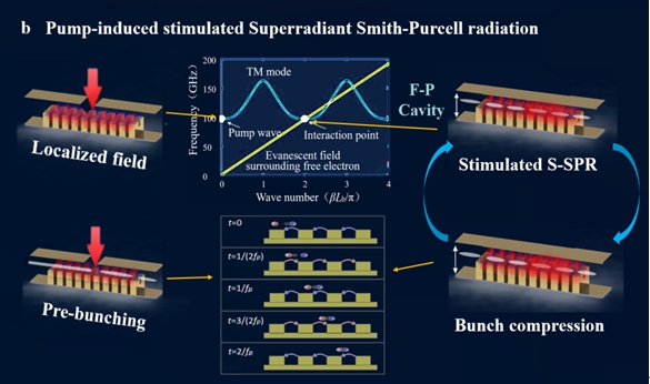 Figure 1 Pump-induced stimulated superradiant Smith-Purcell radiation (PIS-SPR) and compact device.