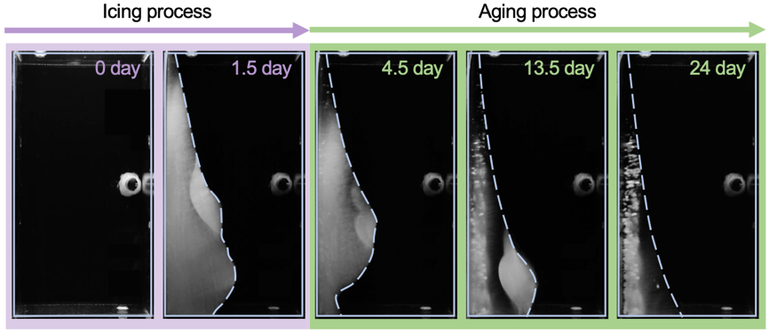 With a well-controlled ice-water phase change experimental system, the research team studied the complete process of salty water freezing till the final state over a period of 20 days. After a relatively rapid icing process, the ice layer continues to age slowly, characterized by a gradual decrease in its porosity (Fig. 1).