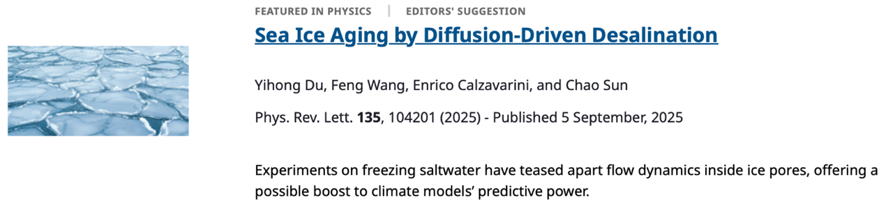 The research paper, titled “Sea ice aging by diffusion-driven desalination”, was published in Physical Review Letters. The paper was also selected as an Editors’ Suggestion, and received coverage in American Physical Society’s Physics Magazine.