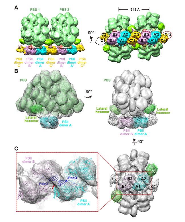 (A) The structure of a double phycobilisome–photosystem II supercomplex at a resolution of 15.6 Å. (B) The structure of a single phycobilisome–photosystem II supercomplex at a resolution of 14.3 Å. (C) Photosystem II dimers A and B, and (inset) two PsbO subunits bind with each other at the interface of adjacent photosystem II dimers.
