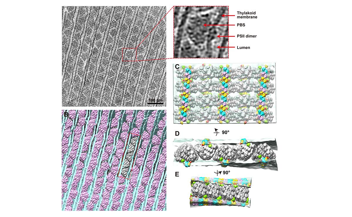 (A) A tomogram cross-section of phycobilisomephotosystem II supercomplexes. (B) Spatial mapping of phycobilisomes (purple) attached to photosystem II dimers in the thylakoid membrane (blue). (C–E) Insets from (B) at different angles. Thylakoid membrane (light blue) and phycobilisome (grey).