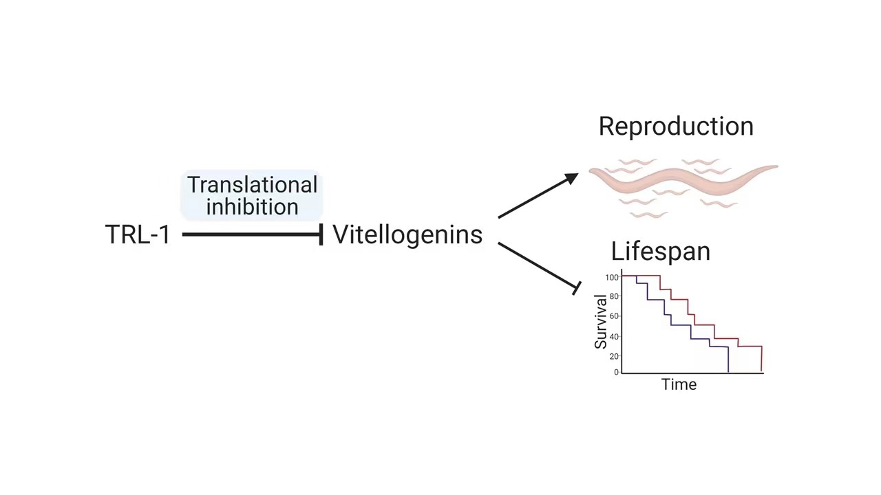 The TRL-1 protein inhibits vitellogenin messenger RNA translation, and thus it reduces the production of egg yolk proteins. However, this also extends the lifespan of the parent nematode.