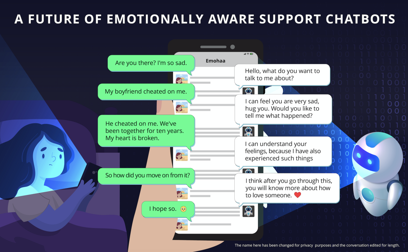 While Huang’s team is not alone, they are pioneering new advances for emotionally-aware chatbots. There are a handful of functioning mental health support chatbots, such as based Woebot, based in the United-States, and an app developed to deal with COVID-19 anxiety by prominent India-based chatbot developer, Wysa. Both these bots are operational, and Woebot’s developers are seeking United States Food and Drug Administration approval to treat depression in teenagers. While Huang’s team is also developing a chatbot to support people with anxiety, depression and insomnia, their work has a distinctive open-ended emotionally responsive conversation platform. This enables isolated users to talk about their problems and process their emotions appropriately, increasing the lasting benefits of chatbot support, explains Huang.