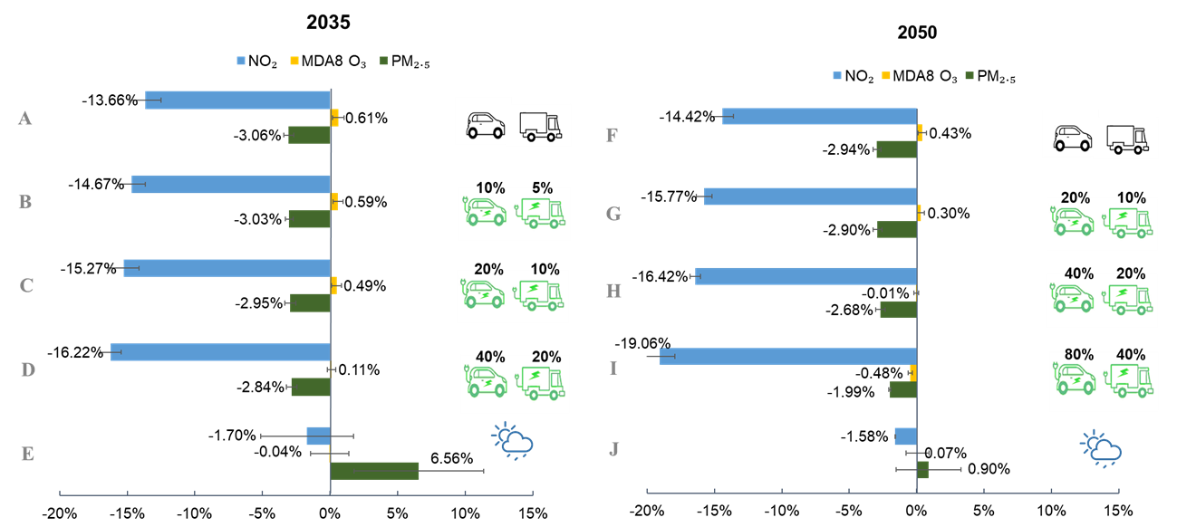 Figure 4. Reduction ratios of NO2, MDA8 O3, and PM2.5 concentrations under different traffic scenarios in 2035 and 2050 relative to 2019. (A-E) and (F-J) represents baseline traffic emission scenario from EMFAC, three electrification scenarios and future climate change scenario in 2035 and 2050, respectively. The error bars represent uncertainty of model predictions calculated by the Monte Carlo method. Random sampling was repeated for 100 times considering uncertainty of each variable in prediction of each scenario.
