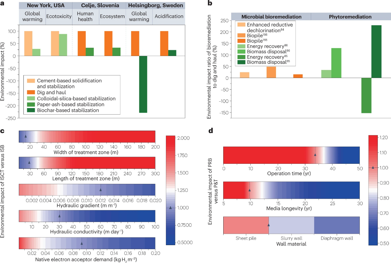 This study systematically analyzes four sustainable techniques for remediating contaminated soil and groundwater: Solidification/Stabilization remediation using green low-carbon materials, in-situ bioremediation based on plant-microbe interactions, in-situ chemical oxidation-reduction technology employing green and efficient reagents, and risk control technology using highly selective permeable reactive barriers with green materials. By incorporating low-carbon or carbon-negative functional materials and coupling physical, chemical, and biological processes, these sustainable remediation technologies achieve efficient mass transfer and long-term remediation while avoiding highly disruptive ex-situ remediation methods. Sustainable remediation technologies can achieve a 50% to 80% reduction in greenhouse gas emissions (Figure 3) while enhancing soil health and restoring ecosystem functions.