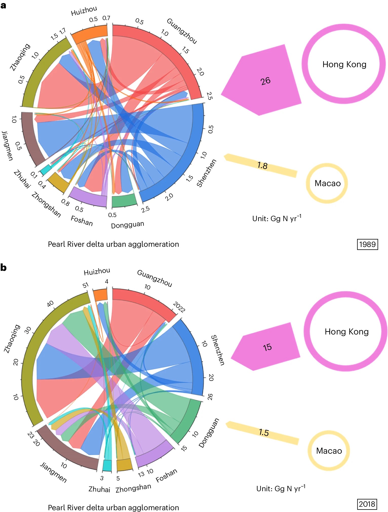 Fig. 3 Inter-city flows of embedded N pollution. a,b, N pollution transfer among Hong Kong, Macao and the PRD region in 1989 (a) and in 2018 (b).
