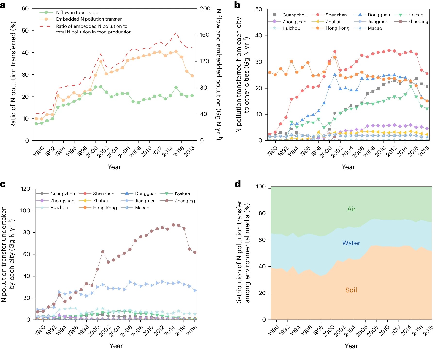 Fig. 2 N pollution embedded in inter-city food trade within GBA during 1989–2018. a, N flow and embedded N pollution transfer in the food trade, as well as the ratio of embedded N pollution to total N pollution in food production. b, N pollution transferred from each city to other cities. c, N pollution transfer undertaken by each city. d, Distribution of inter-city N pollution transfer among environmental media.