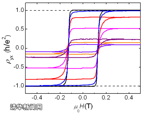 量子反常霍尔效应的实验数据图:不同的曲线显示在不同栅极电压下材料霍尔电阻ryx 随磁场的变化。在一定的栅极电压范围内,零磁场的反常霍尔电阻数值达到量子电阻的数值h/e2。