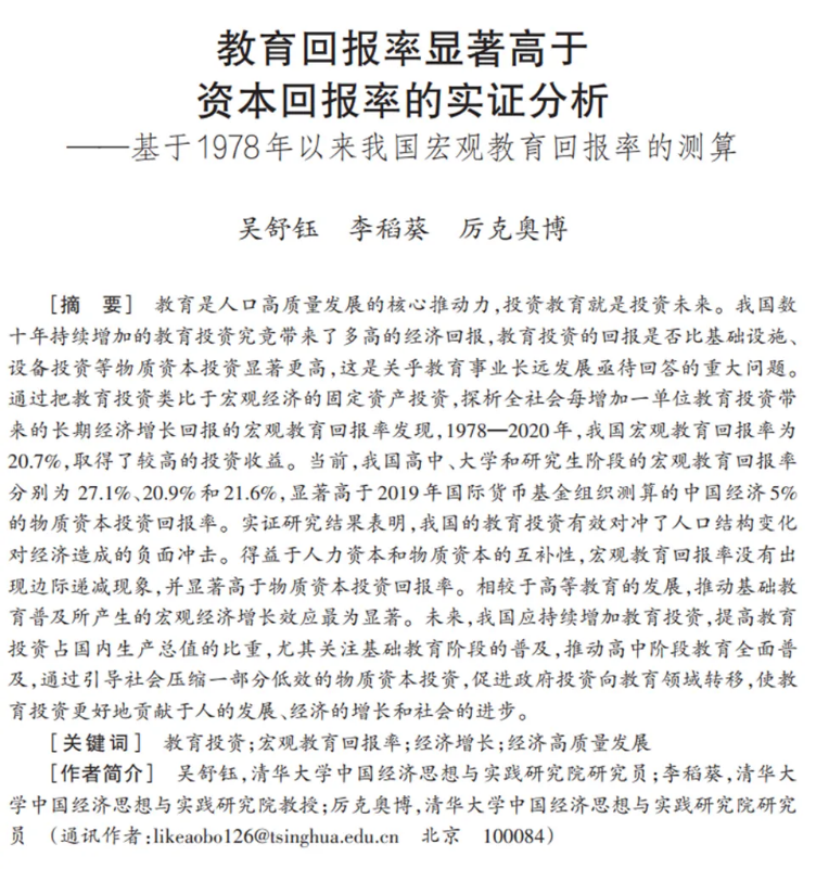 成果名称:教育回报率显著高于资本回报率的实证分析——基于1978年以来我国宏观教育回报率的测算