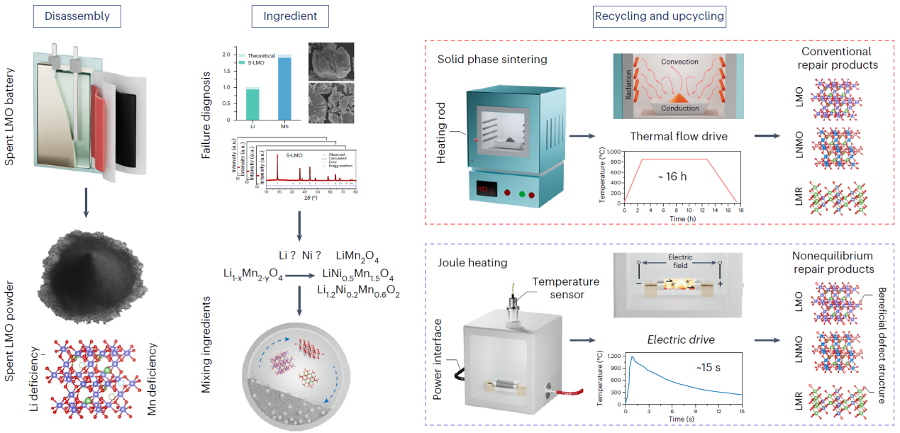 米兰(中国)网8月29日电 锂离子电池被广泛应用于诸多领域,但其有限的使用寿命带来了资源紧张和环境风险等挑战,因此废旧锂离子电池的回收已然成为学术界和产业界关注的焦点。与从废旧电池中提取关键金属的传统冶金方法不同,直接回收工艺可以修复受损材料,并通过有效的处理最大限度地运用其价值。然而,现有直接回收方法依赖长时间加热以实现失效结构的重排。同时,锂离子电池的性能基准不断提升,即使废旧锂离子电池直接再生能够恢复其原始性能,往往也会与最新的市场要求存在差距,这两大问题对直接回收技术的发展与应用提出了全新挑战。