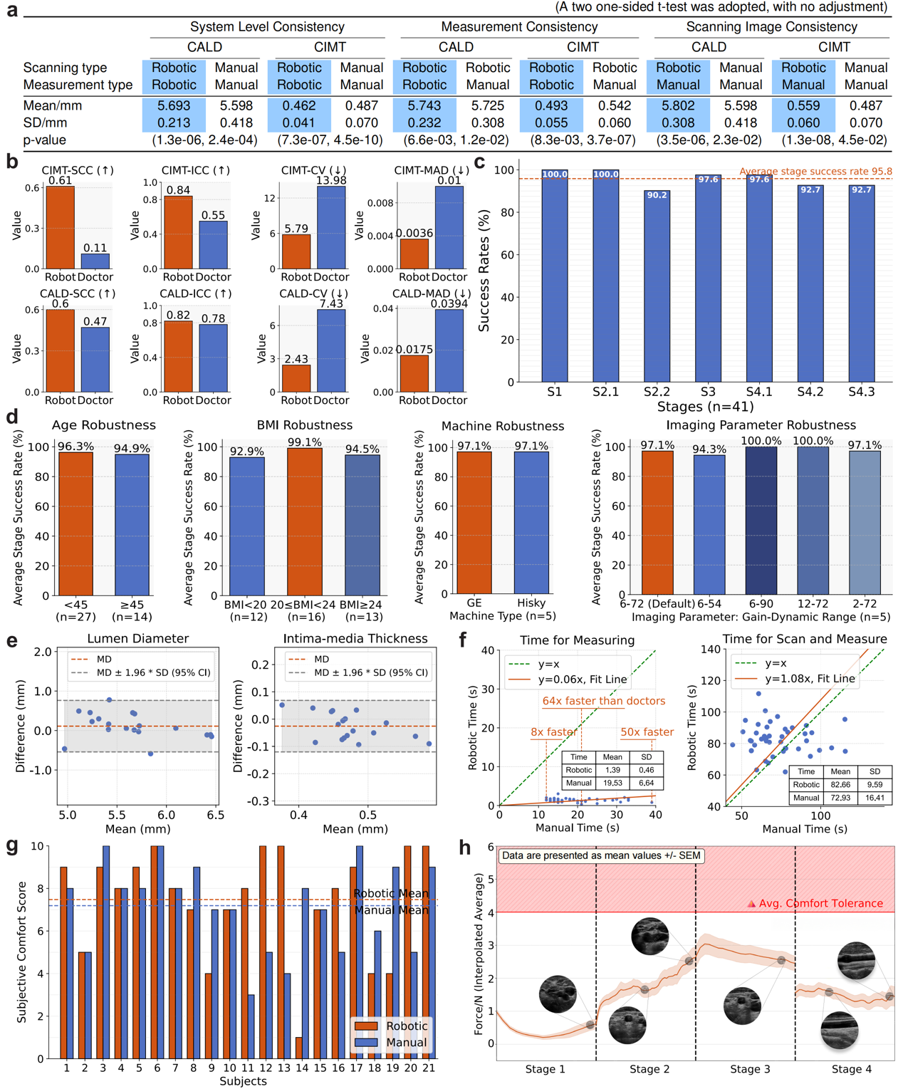 在验证方面,研究采用临床导向的评估方案,并将受试规模较现有研究扩大了10倍。结果表明,机器人系统在多样化人群(年龄19~70岁,BMI16.5~30.8,涵盖男女)中实现了超过90%的扫描成功率(图3c),有效应对不同解剖结构变异,包括斑块患者。同时,系统在年龄、BMI、设备及成像参数等多种扰动下均表现出良好鲁棒性(图3d)。研究进一步证明了该系统在颈动脉关键指标(内膜中层厚度与管腔直径)上的精确测量能力,其结果与专家高度一致(图3a)。值得关注的是,研究首次验证了机器人超声系统在生物计量中的可重复性,突破了传统人工扫描的一致性偏低的局限(图3b)。
