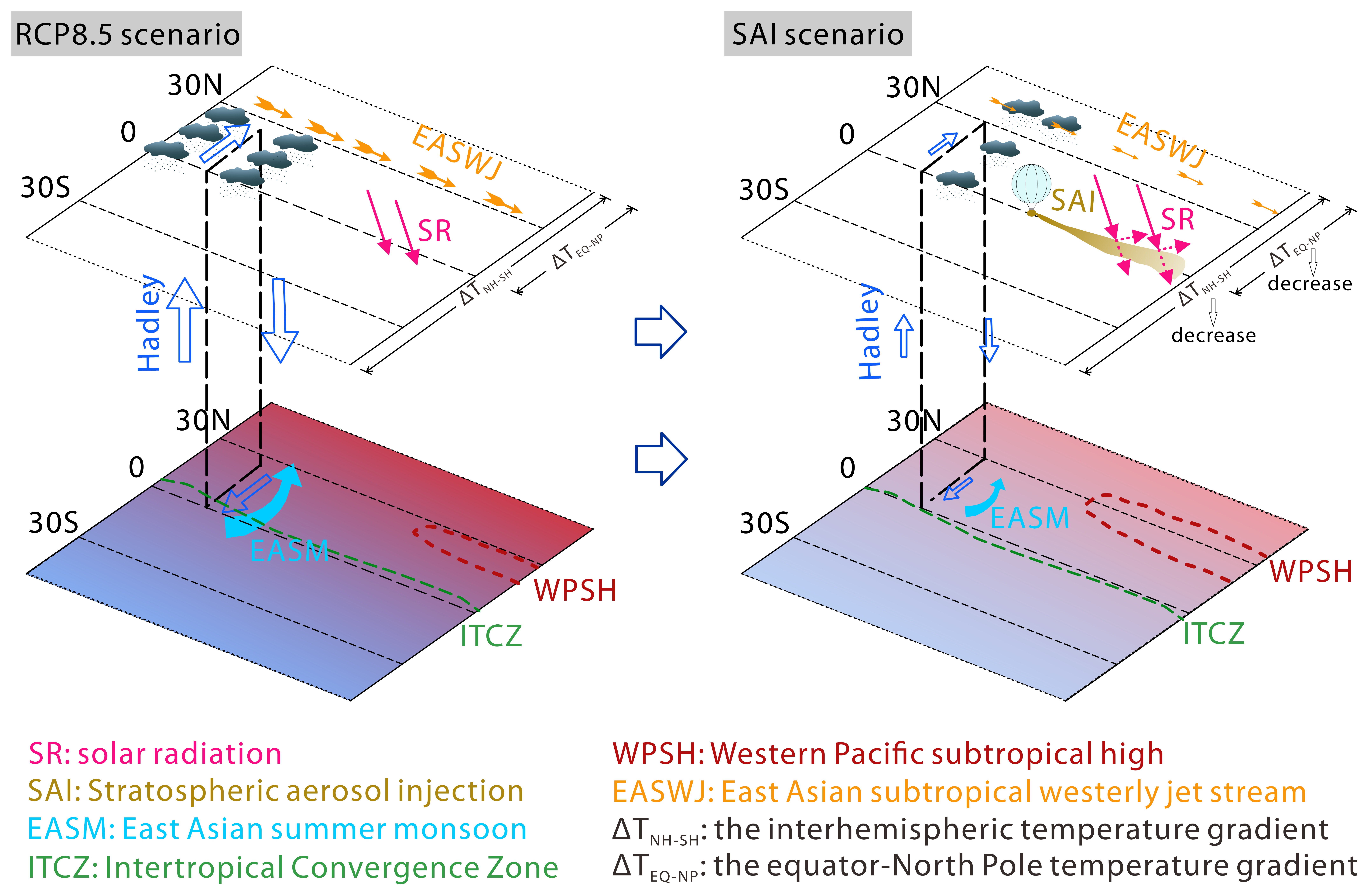 图3.SAI调控中国“南涝北旱”格局的机制示意图