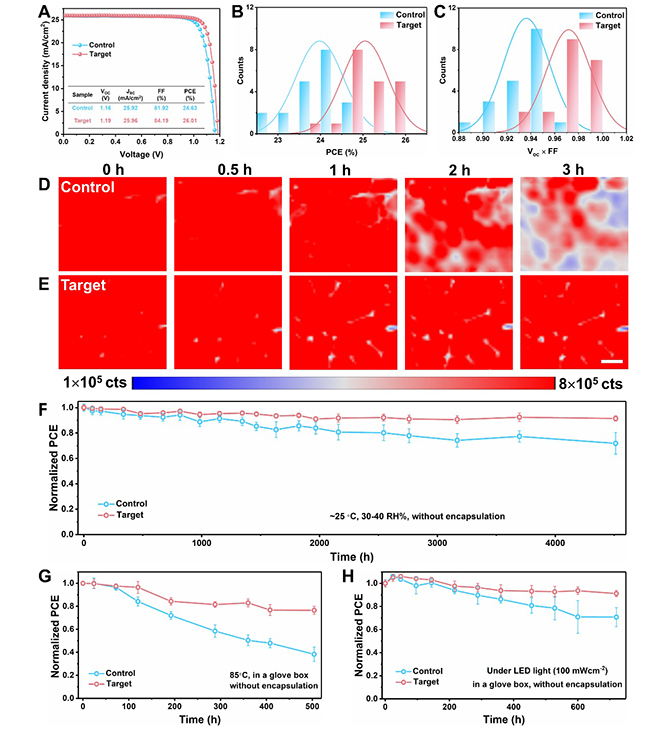 研究团队采用光响应分子界面工程策略,成功制备出正式(n-i-p)结构的钙钛矿太阳能电池,并实现了26.01%的冠军效率(小面积器件)。在稳定性方面,光致发光mapping结果验证了改性后的钙钛矿薄膜优异的紫外耐受性。器件在多种测试条件下均表现出出色的稳定性:在空气中放置4512小时后,仍保持91.5%的初始效率;在连续光照720小时后,效率保持在91.2%;在85°C氮气中老化500小时,效率保持率为77%;在最大功率点(MPP)跟踪测试320小时后,器件仍能维持96.1%的初始性能。该工作为高性能钙钛矿光伏器件中的动态界面调控建立了一种通用的分子设计范式。