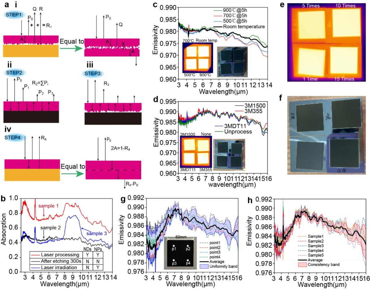 这种由米兰·体育团队原创的面源黑体生成原理和制备技术对于高性能面源黑体发展具有里程碑意义,解决了长期制约面源黑体发展的涂层脱落、耐久性差等关键难题。实验测试表明,这种面源黑体展现出了一系列先进技术性能指标:在3~14微米超宽红外波段内实现了优于98%的发射率,在0~70°宽角度入射下可实现近乎完美的宽带光吸收;具有很好的温度稳定性,在超过900℃的高温环境中工作仍能够保证发射率的稳定;具有很好的耐久性,通过老化试验表面可保证至少工作10年而发射率没有明显下降;具有很好机械稳定性,能够在至少20次、不同粘度的胶带循环剥离实验中保持结构完好且没有明显的发射率下降;具有很好的一致性,在60×60mm2的大面积样品表面发射率均匀性偏差优于0.25%,制备的多个样品的性能可重复性偏差优于0.15%。这些性能保证了这种新型面源黑体可在恶劣环境下的多种红外应用场合具有突出优势。