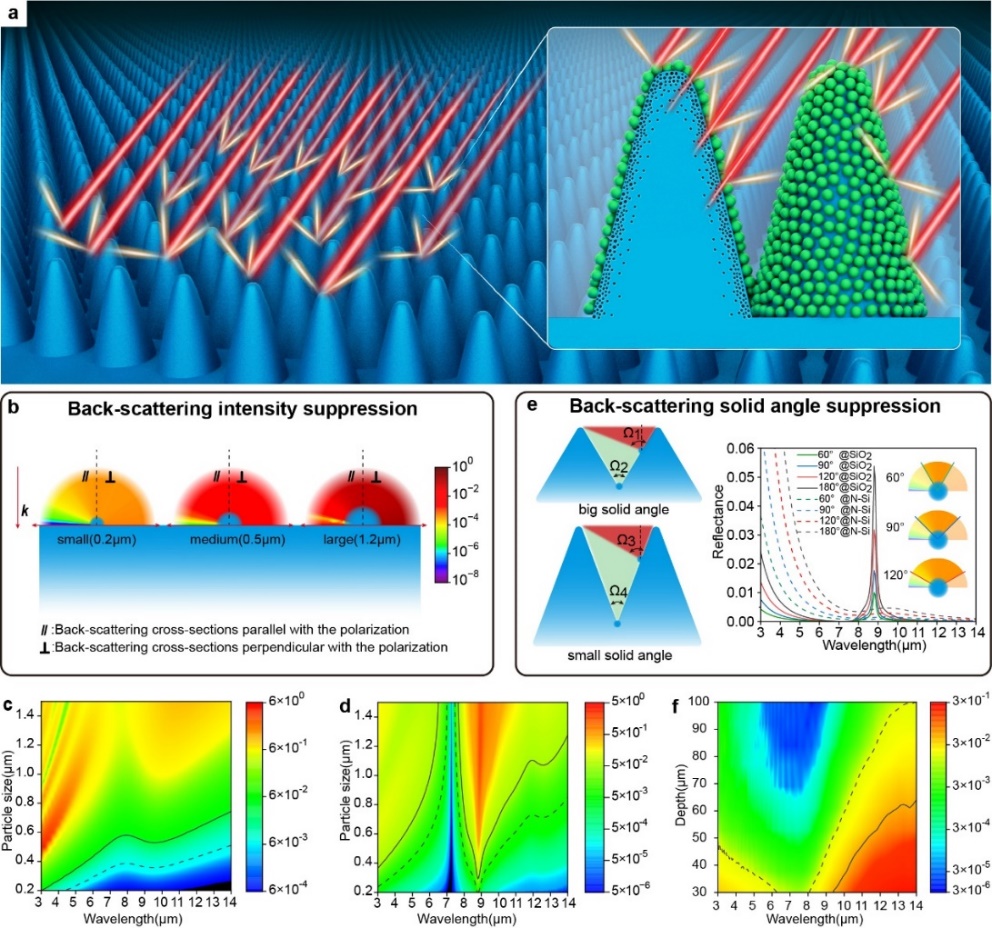 具体而言,通过这种新工艺加工出的结构是均匀覆盖着200纳米直径纳米颗粒的周期性微锥阵列。纳米颗粒的存在能够显著抑制由折射率失配引起的菲涅尔反射,达到较低的表面反射率;周期性的微锥阵列具有很高的深宽比,起到“陷光”作用,使得表面反射率进一步降低。在这两种效应协同作用下,对光的反射抑制能得到最大程度的强化,且对波长不敏感,从而实现超宽波段极低反射率。