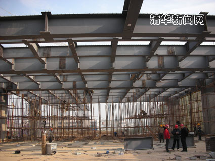 而在土木系结构工程新实验大厅里,却是另一番景象:这里热火朝天,是真正的施工现场和科研前线,繁忙中又蕴含着秩序。大型实验设备发出低沉的轰鸣,头戴安全帽、身着工作服的聂建国和他的团队成员们手持图纸,通过悉心构思和精心试验,逐步构架起他们心中理想的新型大跨组合结构。