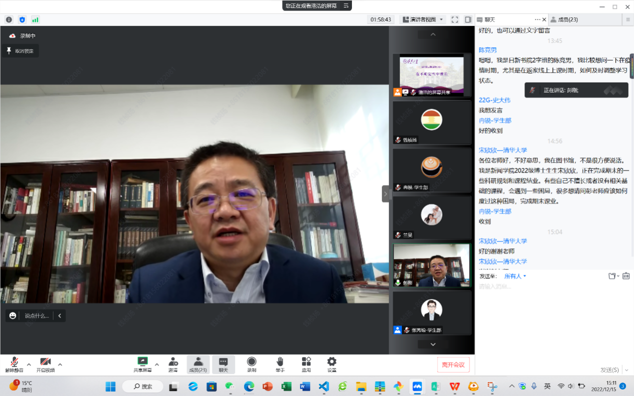 12月15日,副校长彭刚就“在不确定性中成长”主题与20余位学生代表进行线上交流。彭刚回顾了过去三年的疫情发展历程,表示疫情带来的不确定性带给每个人巨大的冲击和挑战,只有积极互相帮助,保持社会交往,认真规划生活,才能把握不确定中的确定性。彭刚勉励同学们,面对暂时的风险和挑战,不仅要咬紧牙关积极应对,更要怀揣信心勇敢面对。针对同学们提出的有关疫情中学习、生活、就业的问题,彭刚一一做了解答,并希望大家在不确定性中收获成长。