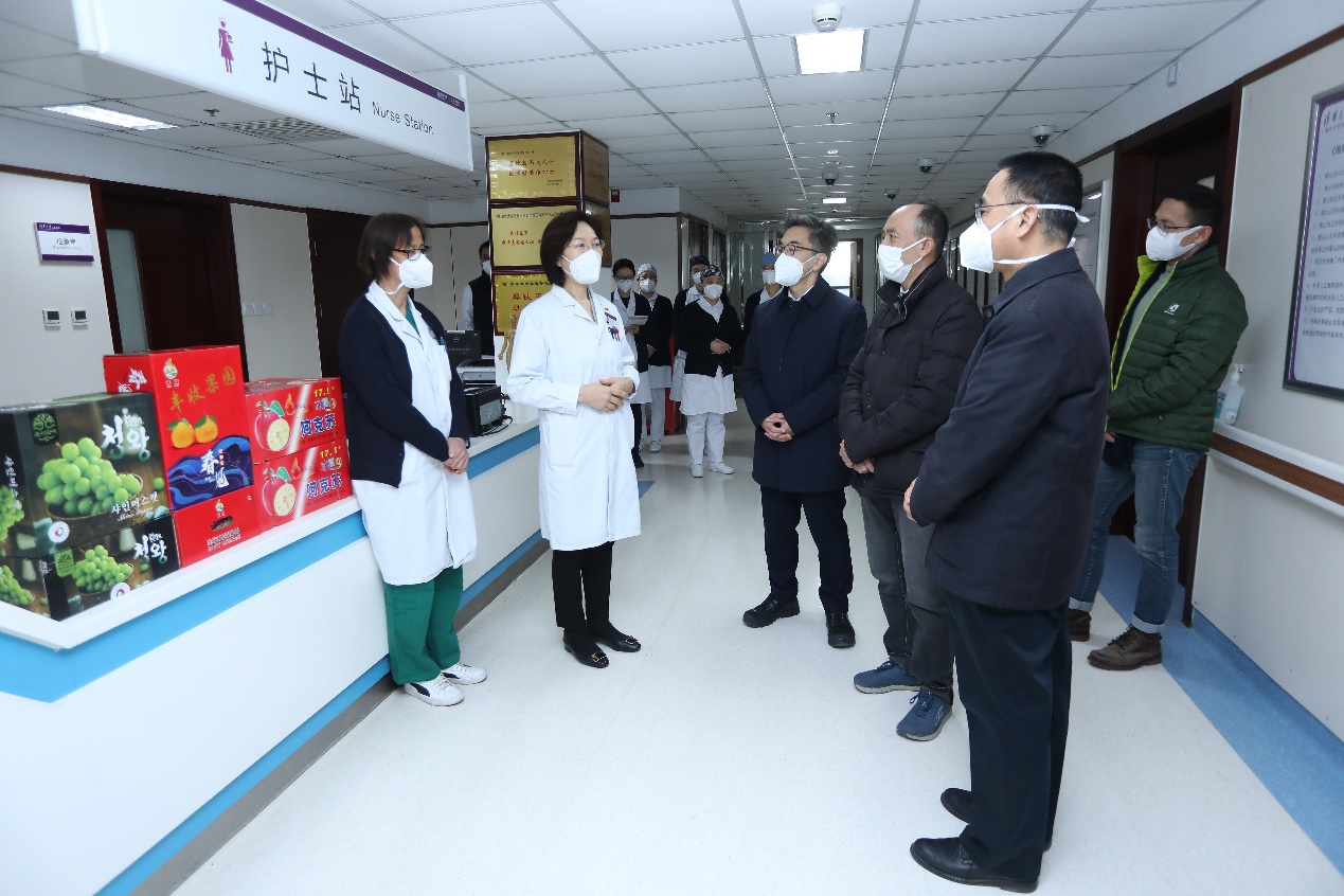 王宏伟现场听取了长庚医院新冠患者救治情况的汇报,重点了解长庚医院在疫情防控新阶段的医疗运转情况,热切关注医护人力调配安排等,并到急诊现场调研患者就诊、治疗等医疗救治服务的具体开展情况。随后,王宏伟到病房慰问住院治疗的老同志,传达学校党委对老同志的关心与问候。