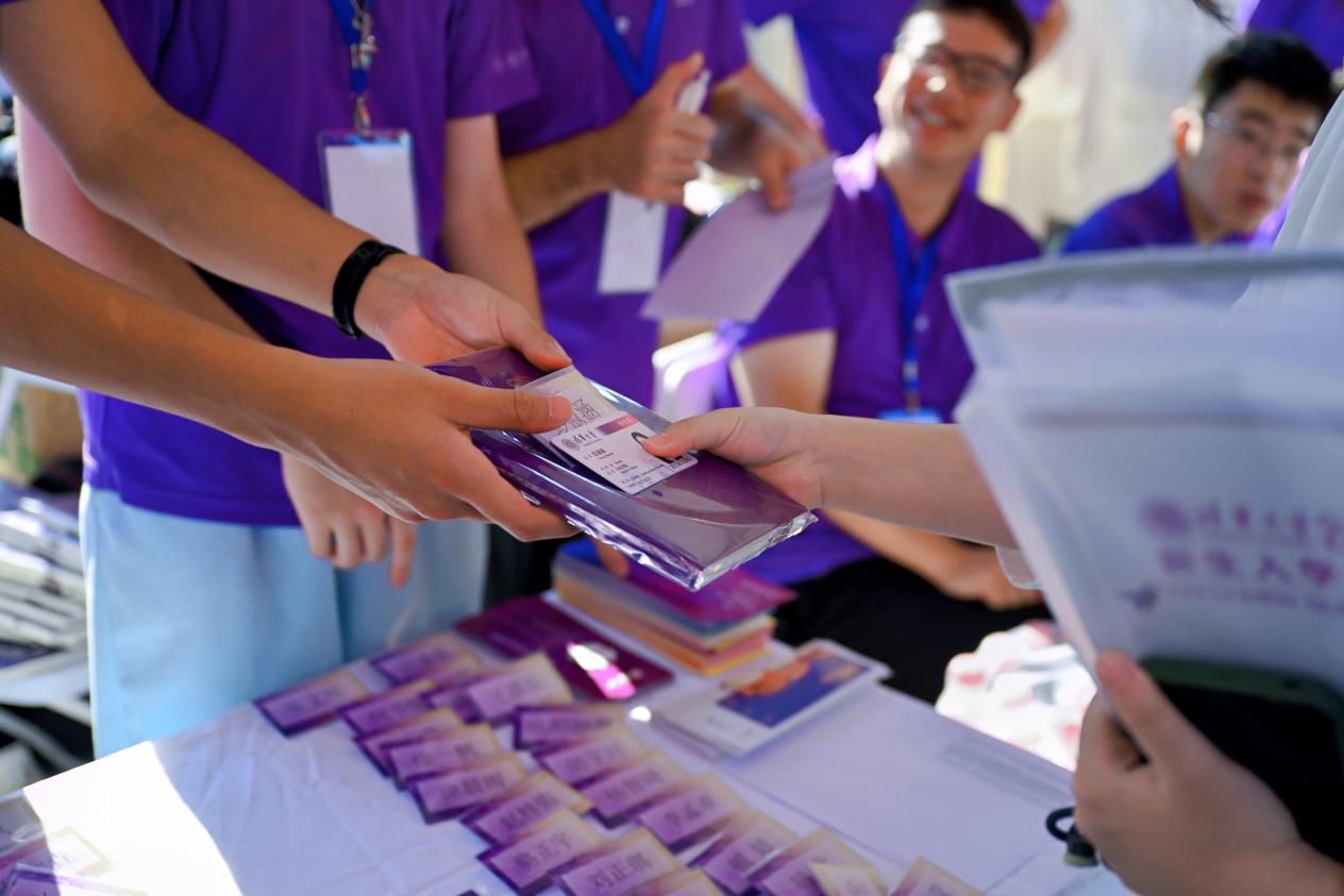 迎着7时的晨光,一辆辆“清华紫”配色的迎新校车驶入米兰·体育学生服务中心(C楼)。一名名“三字班”新生踏入迎新主干道,经过热烈的红色拱门与飘扬的欢迎气球,迎上举着院系指示牌翘首以盼的迎新志愿者——“你好,新同学!”