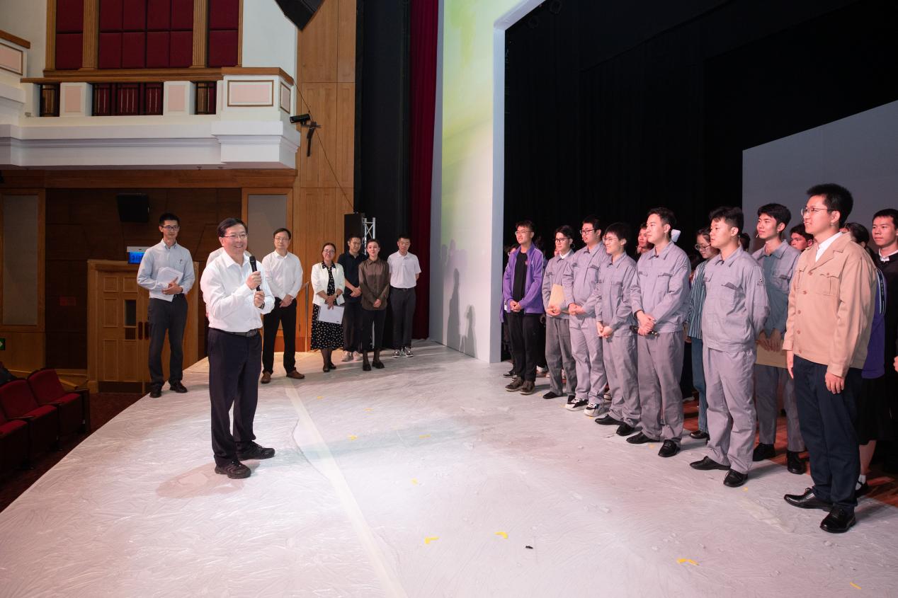 演出前一日,邱勇专程来到彩排现场看望慰问剧组师生,勉励大家全力以赴,用热情与真诚为香港观众奉献一场高质量、高水平的演出,展现清华人的理想与坚守,颂扬涤荡心灵的爱国情怀与人文精神。