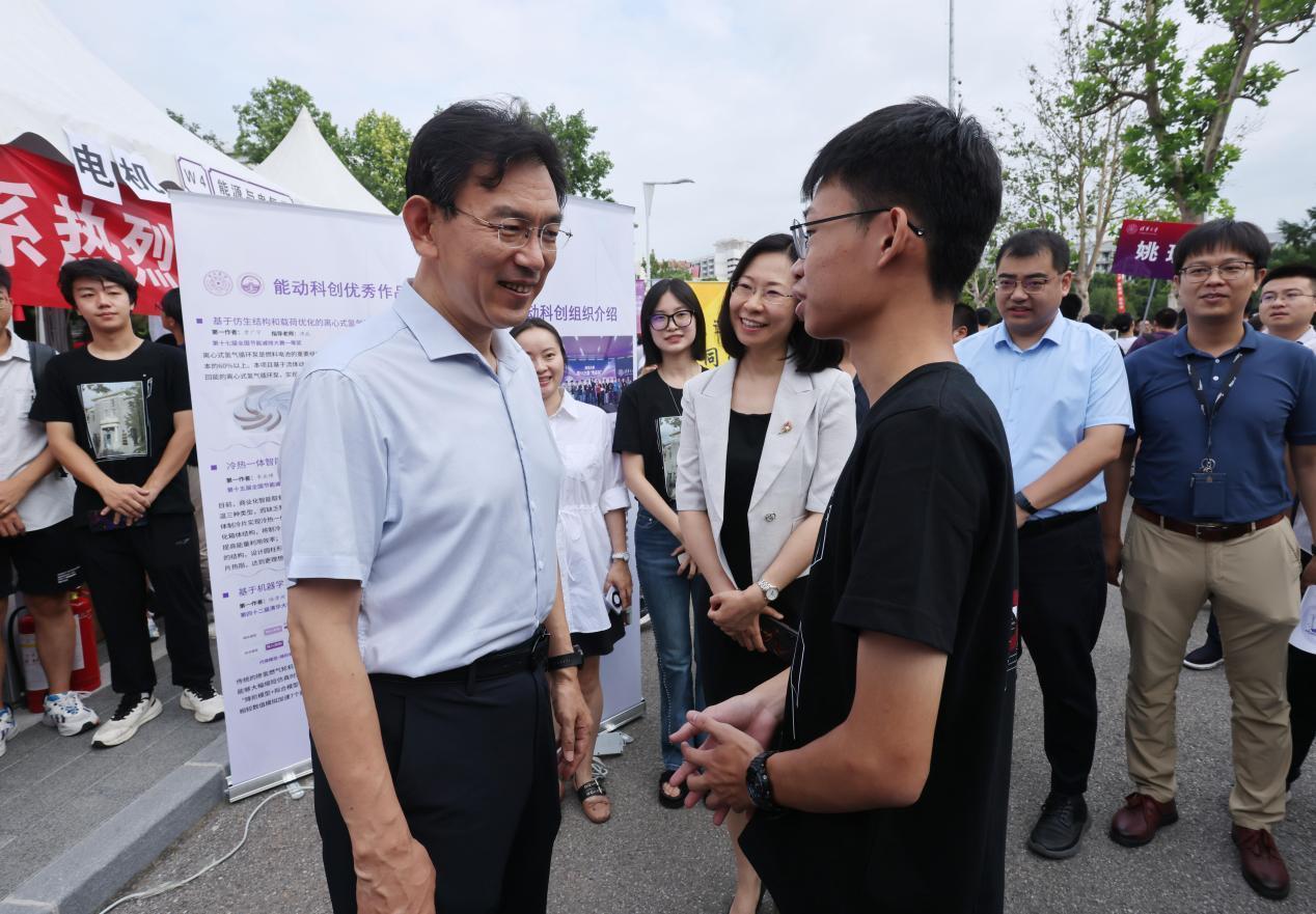 无体育,不清华。体育代表队宣传点前悬挂的一排奖牌格外引人注目。邱勇询问了现场报到新生的专业方向,勉励同学们发扬清华优良学风、传承清华体育传统,延续清华荣光。今年是“两弹元勋”、清华校友邓稼先同志诞辰100周年,以邓稼先为原型的米兰·体育原创话剧《马兰花开》即将迎来第100场公演。邱勇来到学生艺术团宣传点,鼓励剧组师生不断创新艺术形式,向新同学们更好地讲述邓稼先等老一辈科学家爱国奉献的故事。