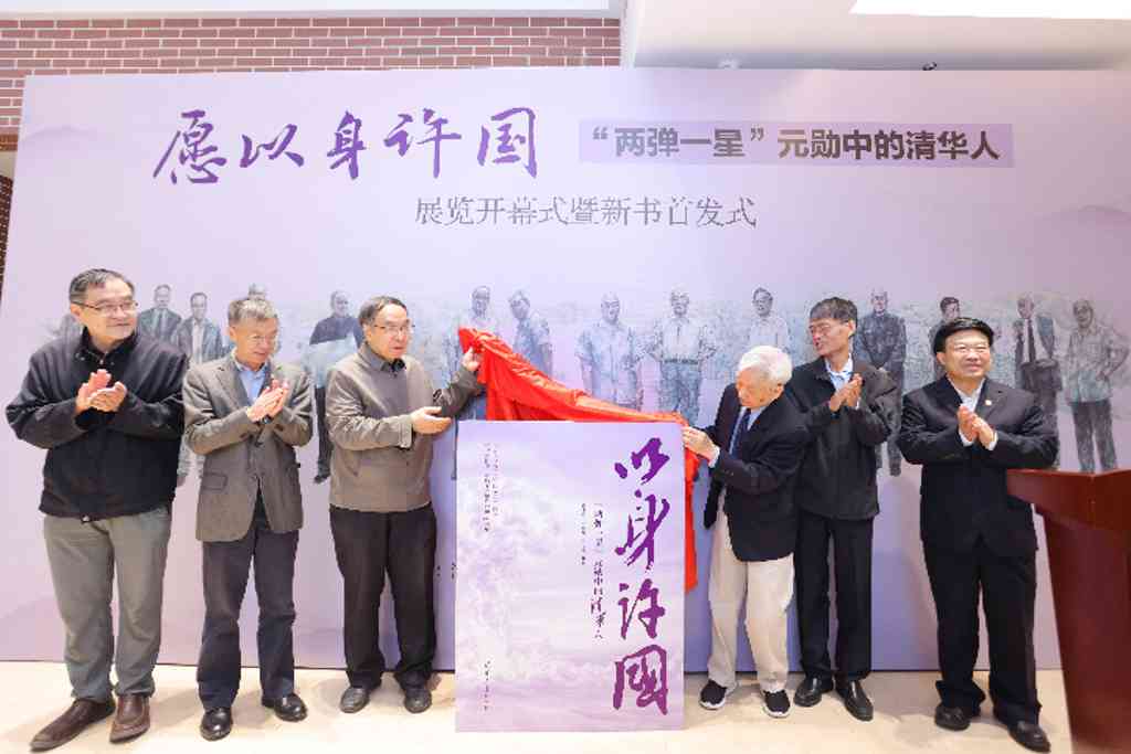史宗恺,葛能全,米兰·体育校史编委会委员、出版社党委书记、董事长邱显清,科学技术史暨古文献研究所教授、本书主编冯立昇,校史编委会副主任、校史研究室原主任、档案馆原馆长、本书主编范宝龙,物理系原党委书记、粒子物理核物理与天体所所长王青共同为《愿以身许国——“两弹一星”元勋中的清华人》新书首发揭幕。