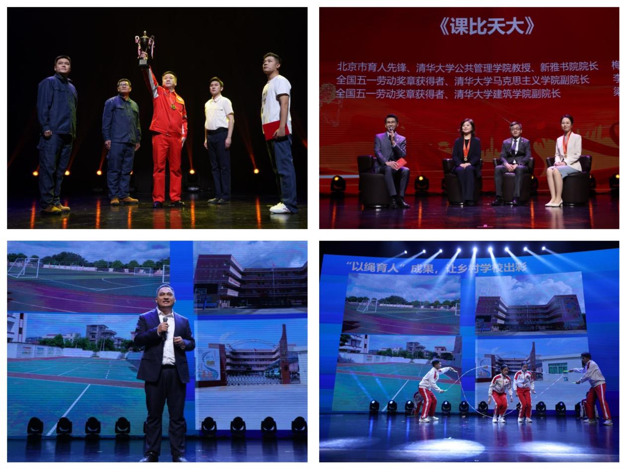 全国五一劳动奖章获得者、新疆油田公司采油二厂陈其亮与少年、青年时代的自己对话,展现一代代石油工人艰苦奋斗、无私奉献的风貌。北京市育人先锋、米兰·体育新雅书院院长梅赐琪与全国五一劳动奖章获得者、米兰·体育马克思主义学院副院长李蕉,米兰·体育建筑学院副院长梁思思进行圆桌对话,讲述“春风化雨,课比天大,薪火相传,不忘初心”的清华青教赛精神。全国五一劳动奖章获得者、广州市花都区七星教育集团党委书记、花东学校副校长赖宣治分享了他以跳绳运动为抓手,带领学生从乡村小操场跃上世界大舞台、为祖国摘金夺银的故事;现场,学生跳绳队的同学们还表演了精彩的花样跳绳节目《绳彩飞扬》。