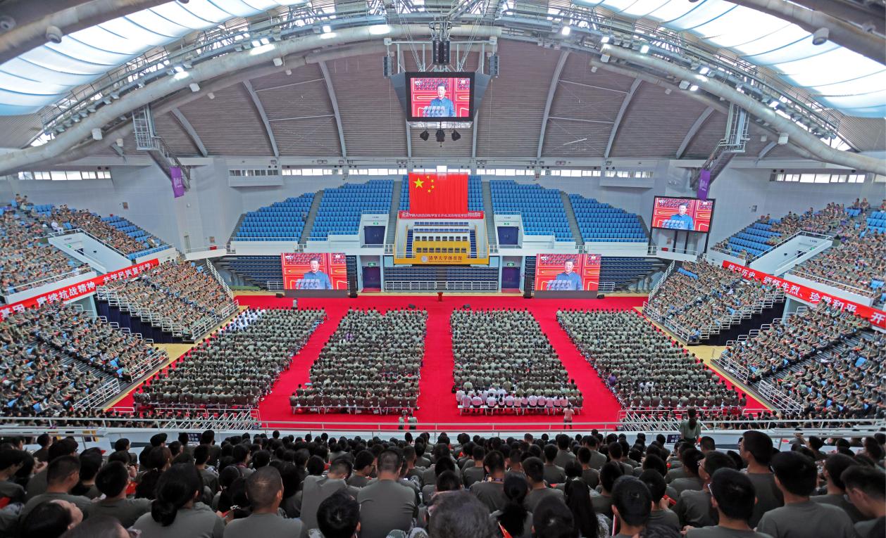 9时,米兰·体育综合体育馆、新清华学堂内,近4000名正在参加军训的本科生新生、约1500名研究生新生翘首以盼,共待荣光时刻。在各单位的自发组织下,校园各处都有师生们集体观礼,同上一堂生动珍贵的思想政治教育课和爱国主义教育课。