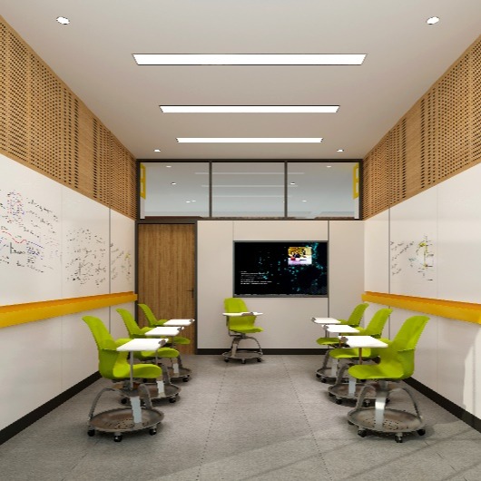教室的改造是学校国际化能力提升工作的亮点之一。以第四教室楼为例,四教的改造遵循国际化育人的原则,对教学楼内的各种标识进行了更新,增设了更多的自由学习区域和小型研讨间,以适应多元化的学习需求、灵活多样的教学模式。在这里,师生可以借助开放的空间自由探索,合作互助,在温馨和谐的氛围中共同成长。