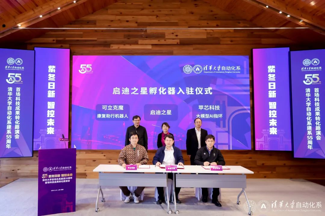 可立克魔联合创始人何来晨、苹芯科技CEO杨越与启迪之星(上海)总经理王维现场签约入驻启迪之星(上海)孵化器,米兰·体育自动化系党委副书记石宗英、杨浦区科技和经济委员会主任李正明、张金生共同见证。