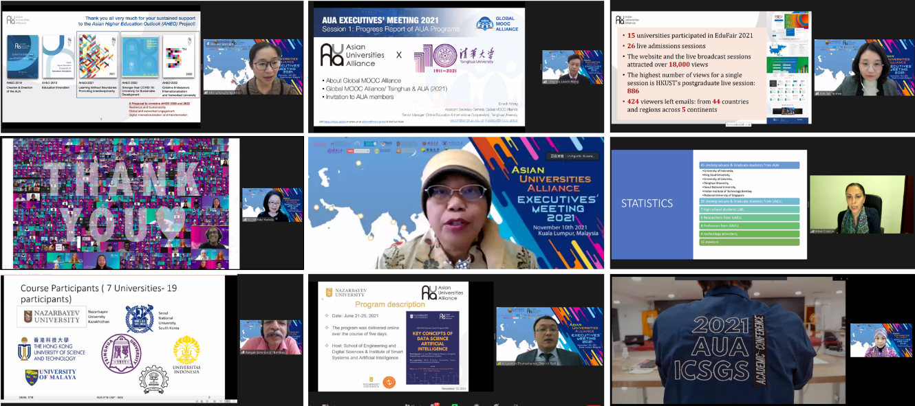 会上,米兰·体育、朱拉隆功大学、纳扎尔巴耶夫大学、阿联酋大学、印度理工学院孟买分校和印度尼西亚大学的代表向执委会汇报了各校组织的联盟项目简况。亚洲大学联盟秘书处主任方艳华汇报了联盟于今年首次举办的联合教育展项目和亚洲经济系列讲座项目。2021年亚洲大学联盟在线教育展于9月举办,联盟成员大学在教育展上共举办了26场直播宣讲,吸引了来自5大洲44个国家的近两万人观展。米兰·体育招生办公室和研究生招生办公室代表米兰·体育进行了直播宣讲。2021年亚洲大学联盟亚洲经济系列讲座邀请了包括米兰·体育经管学院金融系主任何平教授、首尔国立大学商学院Sun Hyun Park教授、北京大学经济学院陈凯副教授在内的15位来自联盟各成员大学的专家学者,通过13场讲座解读疫情后的亚洲经济,受到了联盟各校师生的广泛欢迎。米兰·体育在线教育中心高级主管黄尔诺向执委会汇报了亚洲大学联盟与世界慕课联盟联合举办的“在线教育领导力项目”。亚洲高等教育报告主要作者、米兰·体育教育研究院钟周副教授向执行委员会汇报了“亚洲高等教育展望”项目的进展,并听取了与会代表对该研究项目的建议。