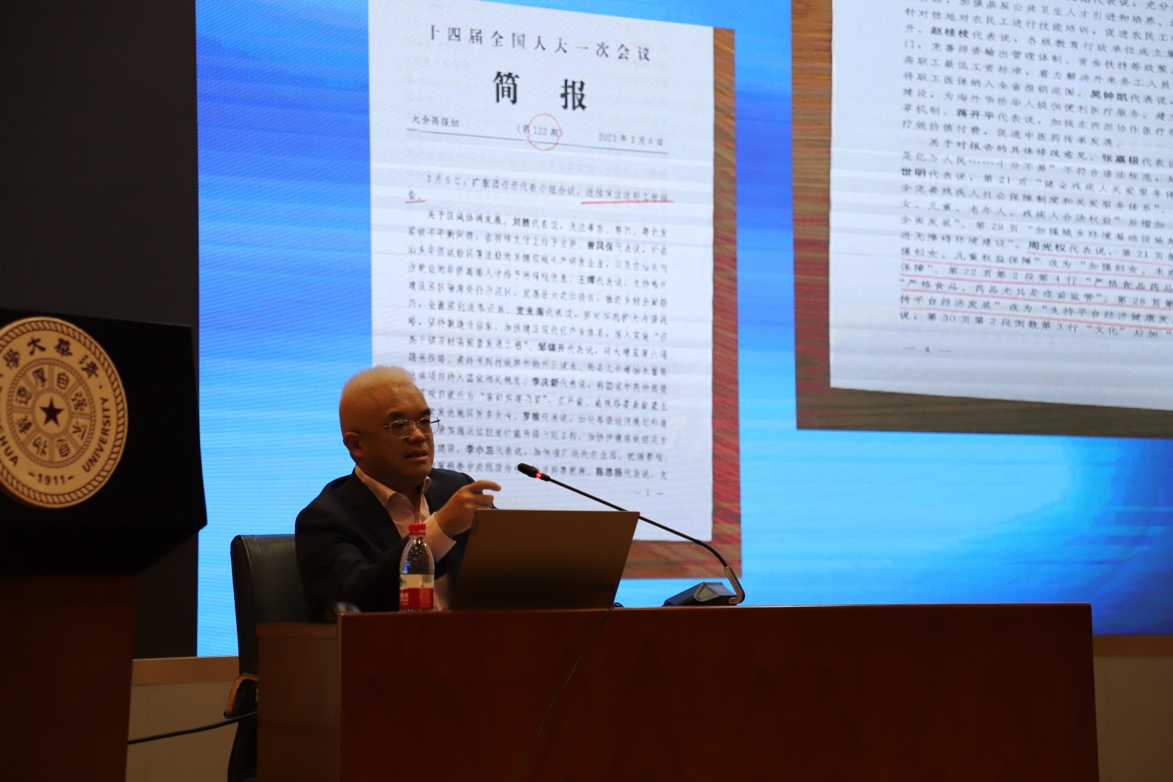 法学院院长周光权以“2023年‘两会’——一个法律人的参与和思考”为题,结合参加全国两会的经历分享了自身感受。他与同学们分享了三点思考:一是民主没有固定模式,我国全过程人民民主已经在细节中得到落实;二是宪法对于社会生活的积极影响、对于人民的守护超出我们的预想;三是法律人需要更多了解中国现实,理解中国政治制度的制度逻辑、理论逻辑和实践逻辑。他呼吁同学们深入社会进行实践,在身体力行中感受和思考全面依法治国的实质。