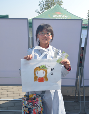 “布袋作画DIY”是此次绿色嘉年华另一特色活动。综合服务楼旁的树下坐满了手拿画笔描绘绿色愿景的同学们。来自中央财经大学的李炆柯同学画了一片充满生机的树林。她说这个活动既可以体验到自己创作的乐趣感,又十分实用。