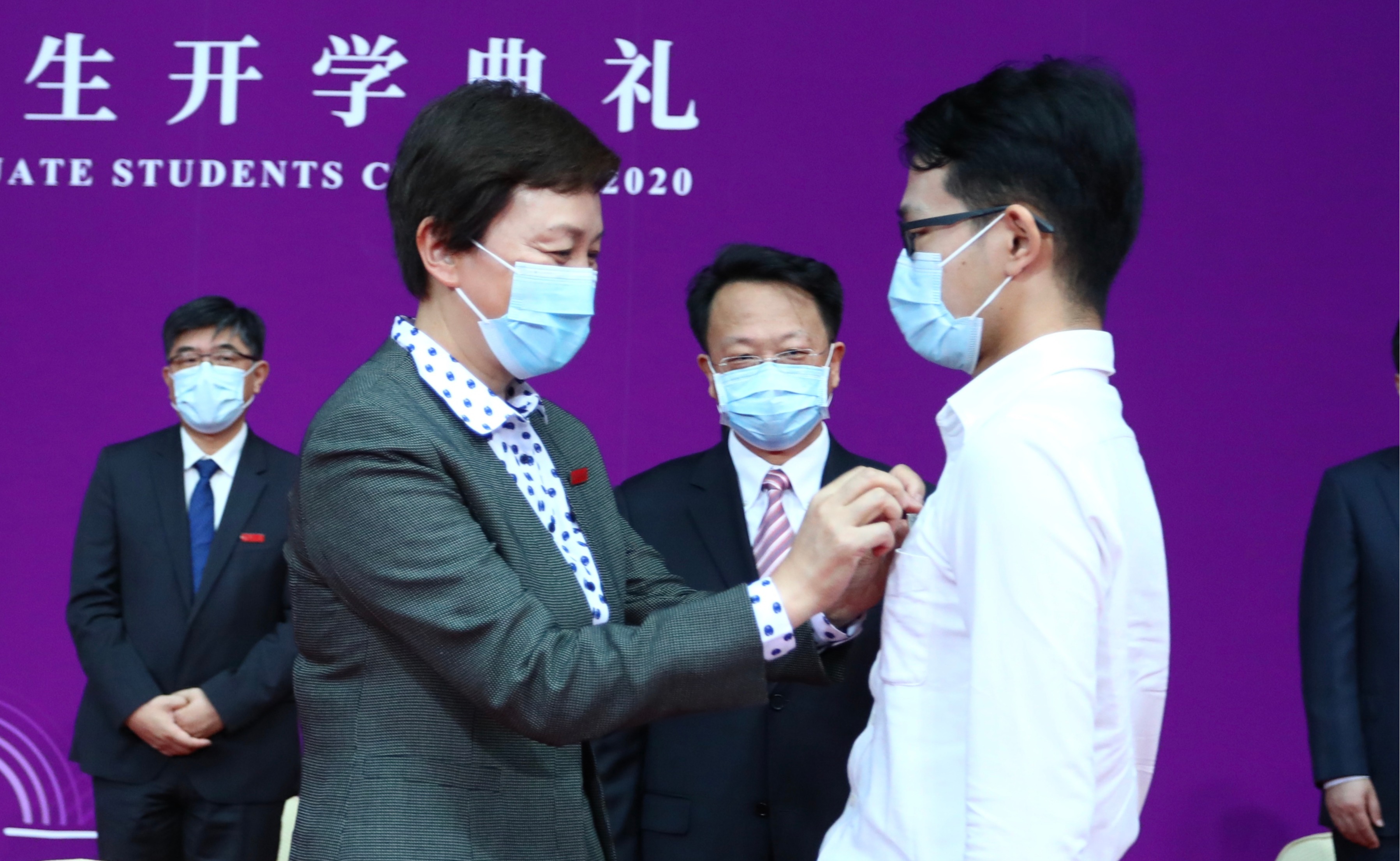 校党委书记陈旭为研究生新生代表戴上米兰·体育徽章