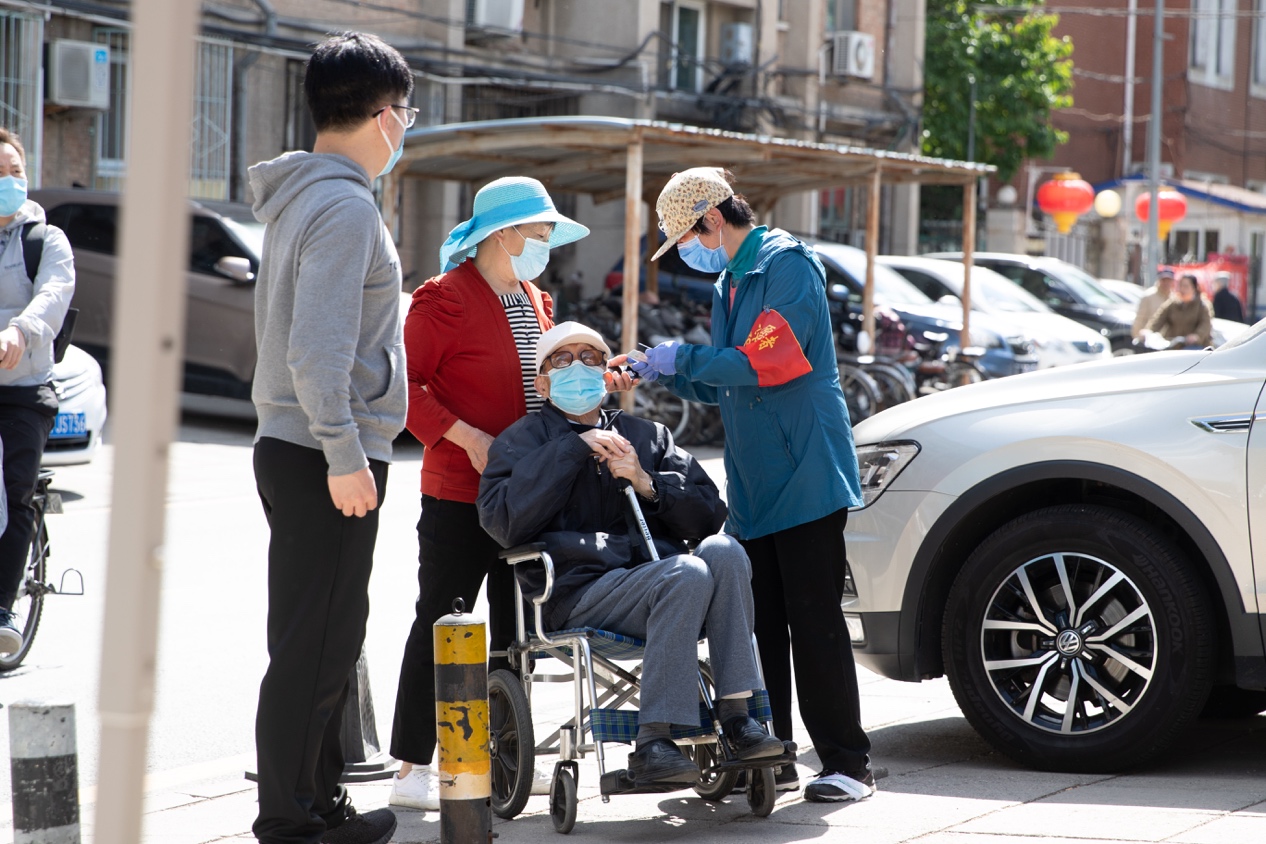 校医院退休大夫陈老师作为志愿者,正在帮助和接待前来接种疫苗的老同志