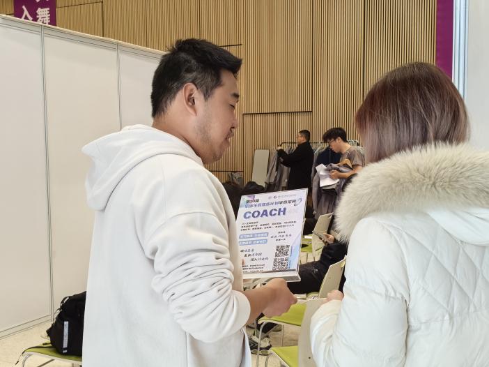 在等候区,学生职业发展中心辅导员向前来量体的同学们推介了“职业生涯教练计划”(Coach计划)、校友导师计划、一对一咨询等精细化的职业辅导项目与资源。