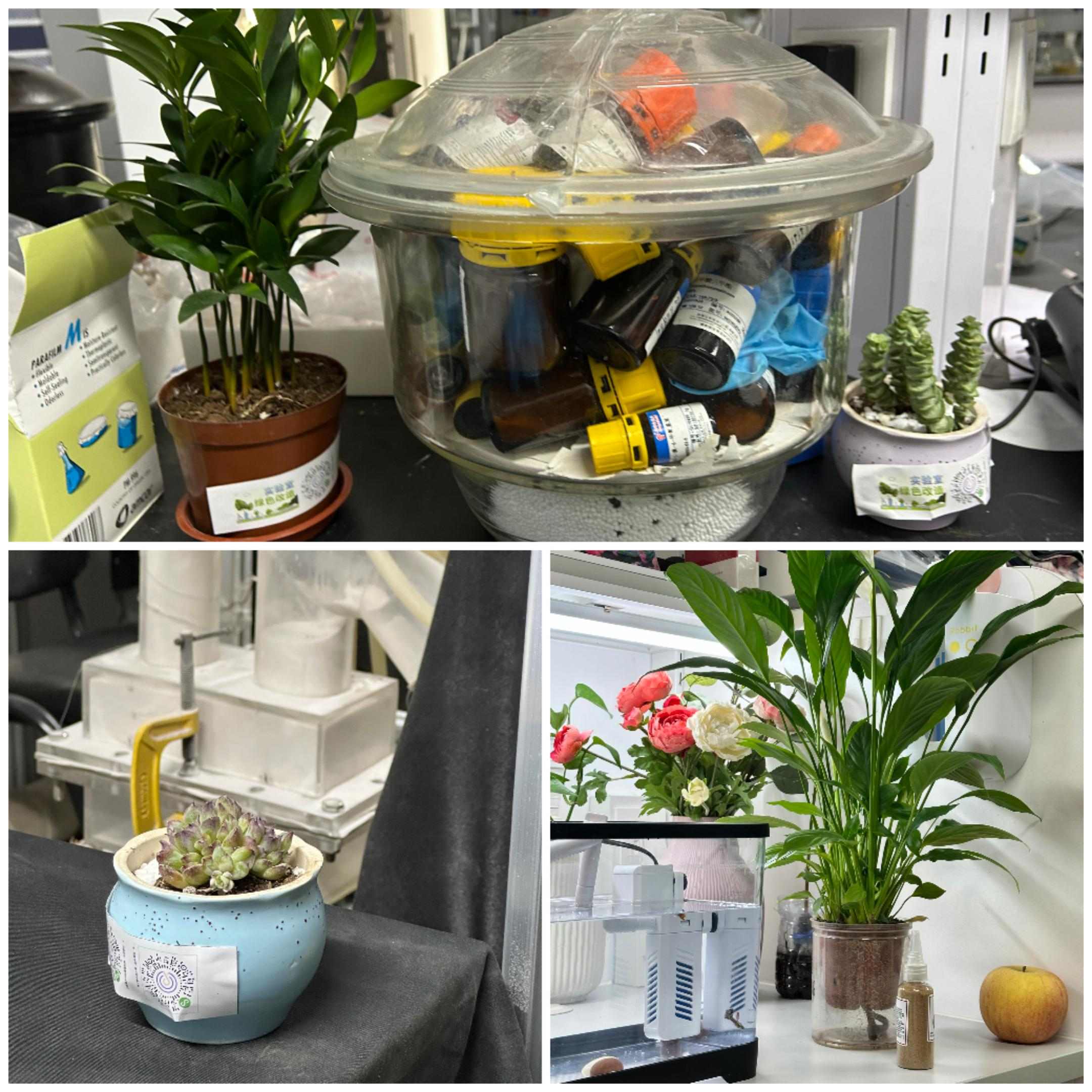 师生校内植绿(上图:“绿植漂流站”发放绿植;下图:实验室绿植美化)
