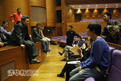 图为一天的排演结束,脱下话剧服装,剧组师生们在空空的新清华学堂里总结当天经验。 高晓蕾 摄