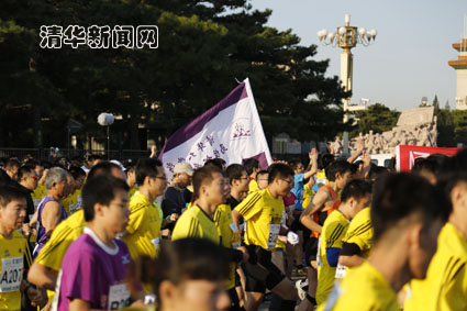 清晨6点,20辆载着清华师生的校车迎着熹微的晨光驶出校园。在天安门广场起点处,清华选手身着统一的黄色T恤,臂戴紫色清华袖章,队容整齐,朝气蓬勃,紫色的校旗迎风飘展,成为起跑点上一道明亮的风景线。在等待出发的时间里,体育部老师带领选手们跳起健美操热身,空气清新爽利,晨曦温柔宁静,大家的欢声笑语缓解了比赛的紧张氛围,让比赛成为一场欢乐的全民健身派对。上午8时许,随着第三声枪响,在一阵阵“清华加油”的欢呼声中,清华选手们满怀豪情、充满自信地踏上征程,向终点进发!