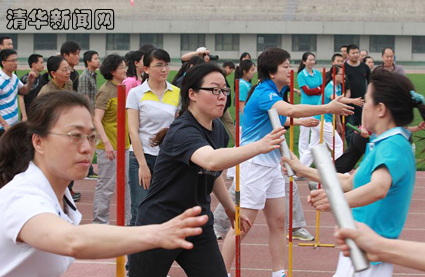 图为教职工运动员传递接力棒。刘弘毅 摄