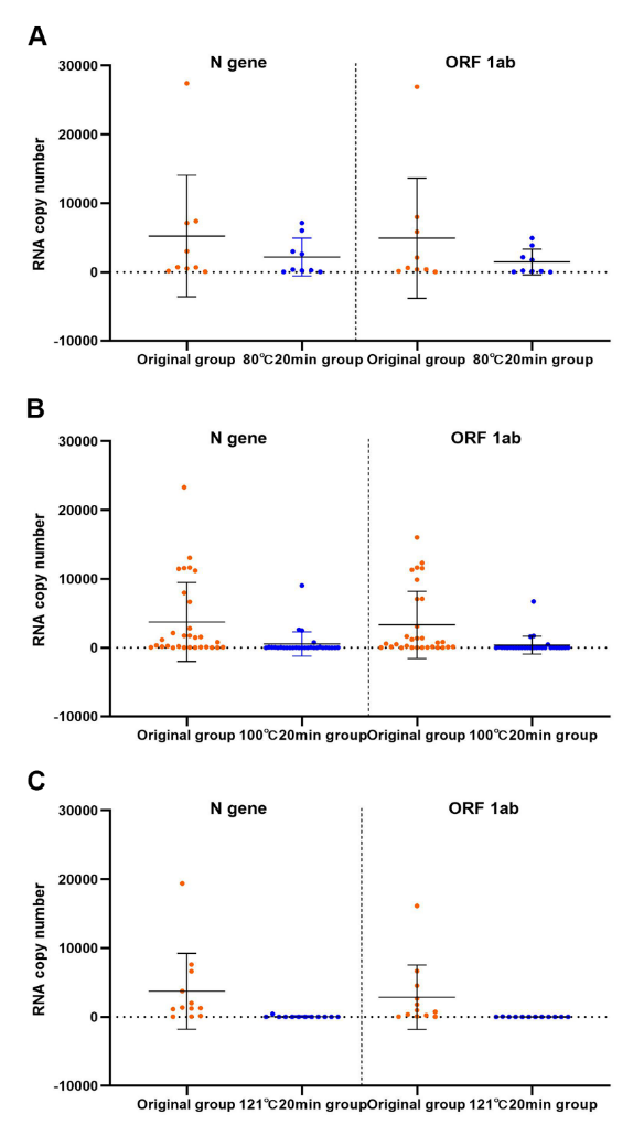 图3 80℃、100℃及121℃加热20分钟处理对生物标本中新冠病毒基因拷贝数的影响