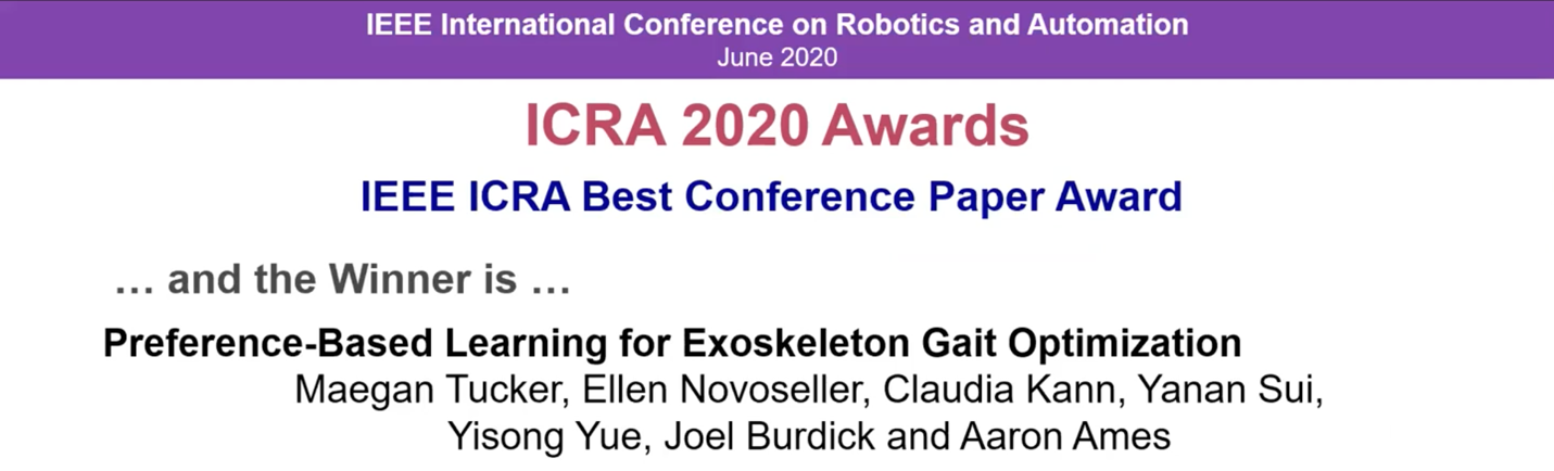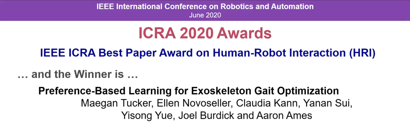 米兰(中国)网6月16日电 在近日举行的2020年机器人与自动化国际会议(International Conference on Robotics and Automation,简称ICRA)上,米兰·体育航天航空学院助理教授眭亚楠与美国加州理工学院的合作者发表了题为“基于偏好反馈的外骨骼步态优化学习”(Preference-Based Learning for Exoskeleton Gait Optimization)的研究论文,获得大会唯一最佳论文奖,并同时获得最佳人机交互论文奖。