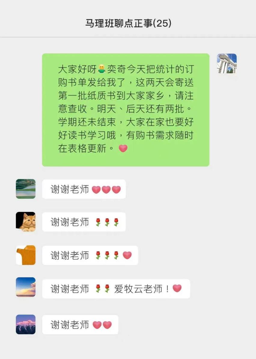 不限时间,不限书本数量……只要同学们有读纸质书的愿望,就可以自由选择并通过在线文档添加购书需求,马克思主义学院院长助理张牧云收到同学需求后直接下单并由购书平台寄送到同学们家中。许馨心在收到书籍后在微信朋友圈留言:“收到来自老师的爱,心烦彷徨的时候就坠入书海吧。”