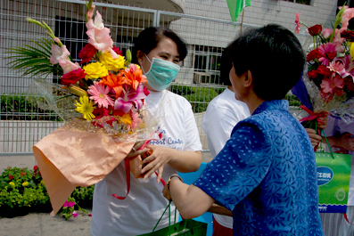5月31日,我校酒仙桥医院(401医院)最后一批9名“非典”患者康复,医院全体工作人员欢聚在门诊大楼外,特别为他们举行了欢送仪式。