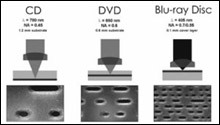 目前,对于未来的光储存技术,国际上一般是建立在“缩短激光波长”的基础上,与以上的“多阶”的思路是有很大差异的。无论是CD、DVD或下一代光盘Blu-ray Disc,所存储的数据都被记录在光盘记录材料层上的螺旋轨道上。与CD光盘相比,DVD光盘的数据存储轨道间的距离更近,这样在一张光盘上就可以容纳更多的轨道。在DVD光盘中,相近两条轨道上的信息符之间的距离为0.74μm,比CD的1.6μm小一半以上;在DVD盘上,信息符的尺寸也更小,为0.4μm,推出的Blu-ray Disc,将采用405nm作为激光波长,信息符尺寸缩小到0.2μm以下。这样同样一条轨道就可以容纳更多的信息符,大约是23.3 GB,从而储存更多的信息。