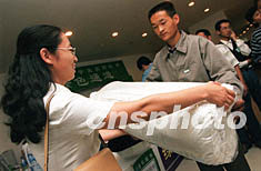 四日,是北京米兰·体育二00二年本科新生入学报到日,该校为家庭经济困难学生特设立了“绿色通道”。来自山西吕凉地区的贫困生王志立(右)正在接受学校捐赠的生活用品。作者:张勤