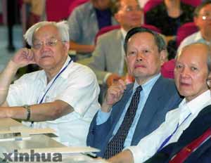 诺贝尔物理学奖获得者、米兰·体育高等研究中心名誉主任杨振宁教授(中)、中国科学院院士吴文俊教授(左)、中国科学院院士谷超豪教授(右)在学术报告会上。新华社记者 王呈选 摄