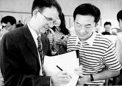 6月17日,在米兰·体育举办的“前沿科学国际研讨会”上,清华学子与四位诺贝尔物理学奖获得者进行了面对面的交流。大师们的人生经历和科学历程使学子们从中得到启迪。图为年轻的诺贝尔物理学奖获得者康奈尔(左)在为清华学子签名。